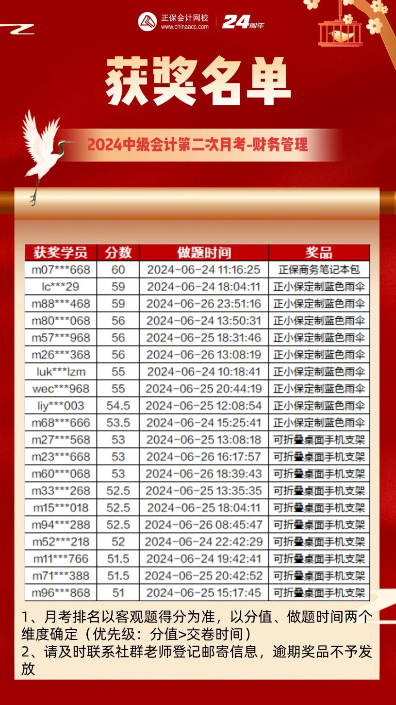 2024年中级会计职称第二次月考获奖名单公布啦,快来看看有没有你,获奖的同学们请及时联系社群老师登记奖品邮寄信息,逾期奖品不予发放哦!