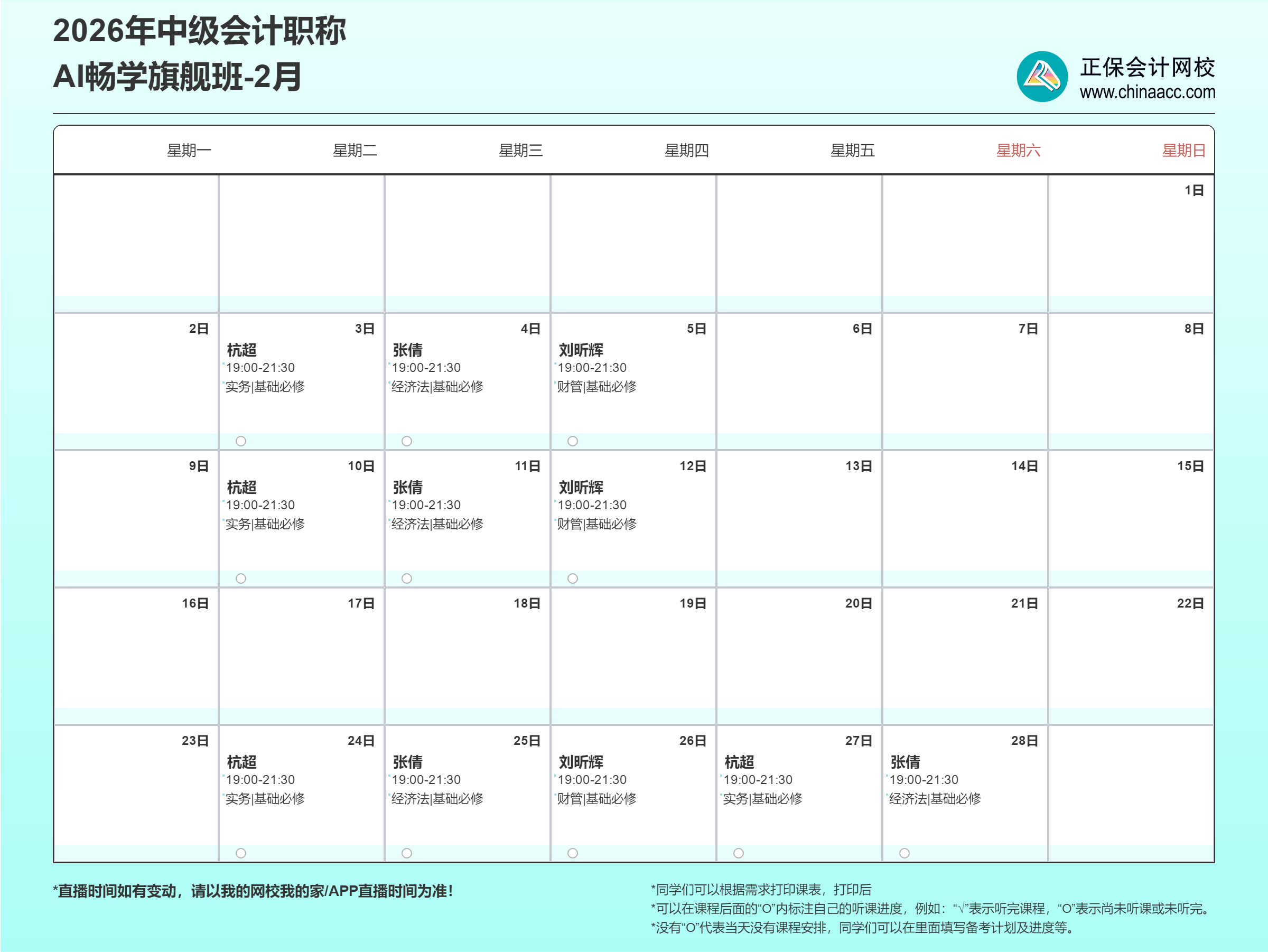 2026年中级会计的备考征程,网校AI畅学旗舰班陪您从现在开始!这份直播课表请收好,记得按时来上课哦!