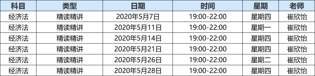 | 经济法 | 精读精讲 | 2020年4月30日 | 19:00-22:00 | 星期四 | 崔欣怡 |