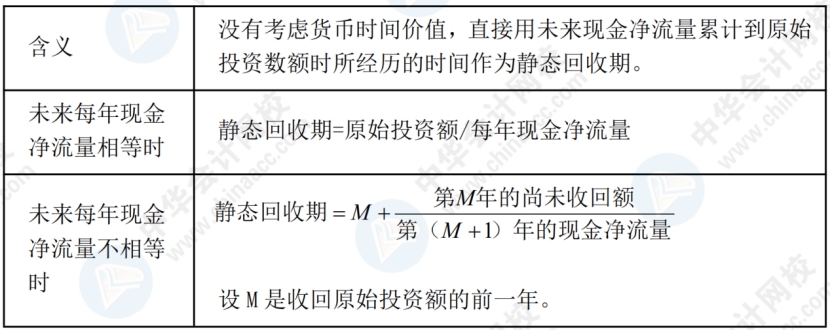 含义:指投资项目的未来现金净流量与原始投资额相等时所经历的时间,即原始投资额通过未来现金流量回收所需要的时间。