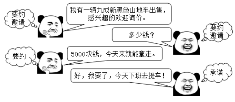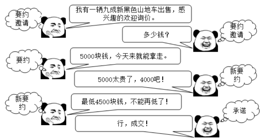 【解释】左边老王为要约人,右边老李为受要约人。老王是向老李发出要约,所说内容具体明确;并且老李承诺后,老王即受到自己意思表示的约束,也就意味着,如果老李下班去找老王提车而不得,则老王要承担法律责任。