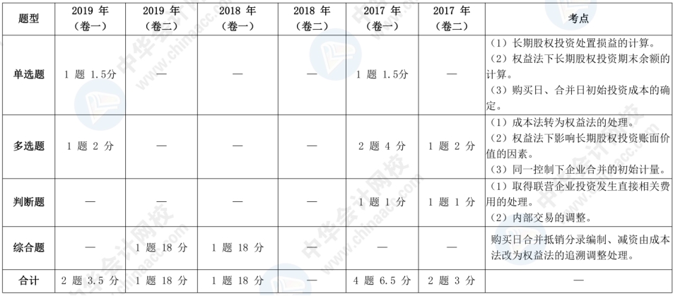 从历年考试情况来看,《长期股权投资》易与合并财务报表、金融资产等内容结合出综合题,比如去年就出了一道18分的综合题,2020年预计分值将在10-12分左右,需要大家高度重视。本章核心考点有: