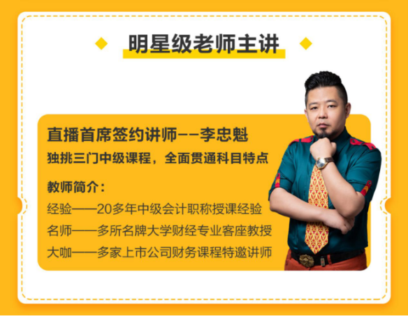 本次主讲老师:正保会计网校直播首席签约老师——李忠魁!独挑中级3科课程,全面掌握教学进度,授课风格一致,学起来更高效!