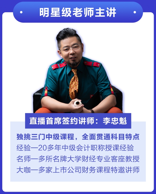 本次课程,由正保会计网校老师李忠魁主讲!李老师有着20多年中级会计职称授课经验,独挑中级3门课!