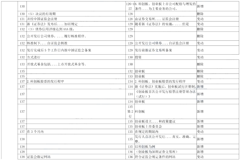 新增“科创板、创业板上市公司配股与增发的条件”、“创业板股票发行程序”;删除面向公众投资者公开发行公司债券的条件中“信用评级达到AAA”这一点;票据法部分个别表述进行调整。