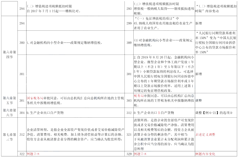 第六章增值税法律制度:本章变动不大,新增有关征收率、税收优惠的政策、增值税期末留抵退税的相关内容,调整增值税进项税额抵扣时限。删除不得从销项税额中抵扣的进项税额的一项内容。
