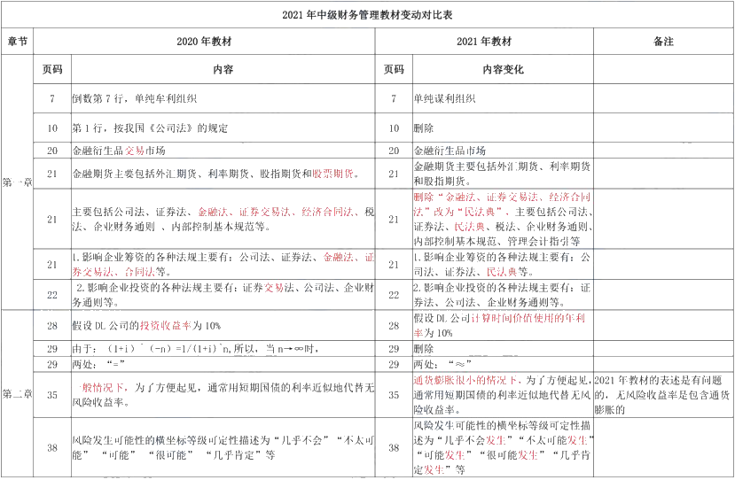 2021年中级财务管理教材变动对比表(点击下载打印学习)