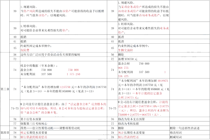 第四章:变化较大,修改支付性筹资动机下的举例;增加混合性筹资动机的标题;删除银行借款的种类(第3种);