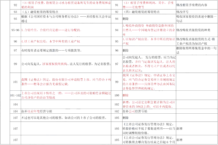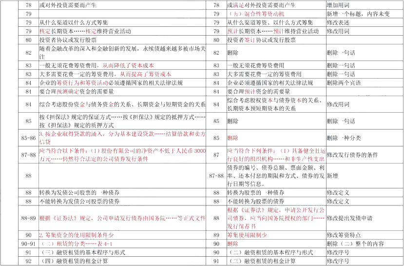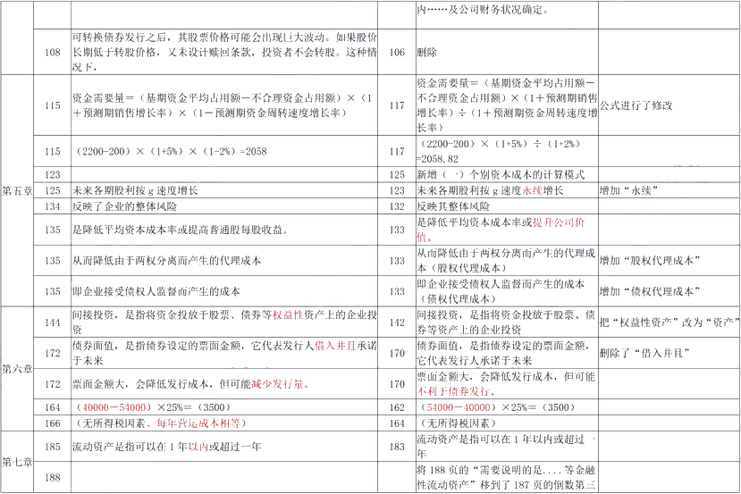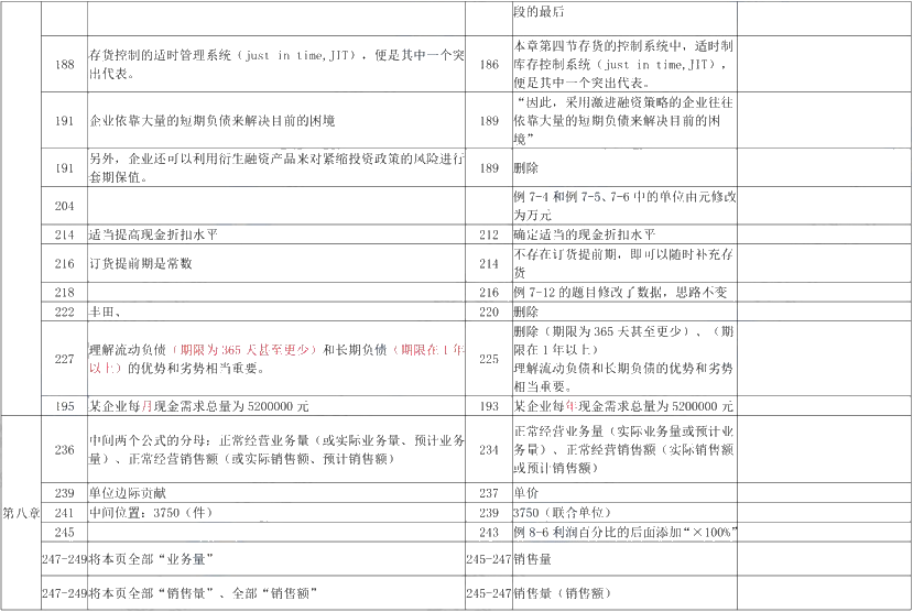 第七章:变动较小,紧缩的流动资产投资策略新增一些内容,激进融资策略部分改写和删除,修改经济订货基本模型的假设中订货提前期的内容,对流动负债的经营优势中删除了流动负债和长期负债的期限。
