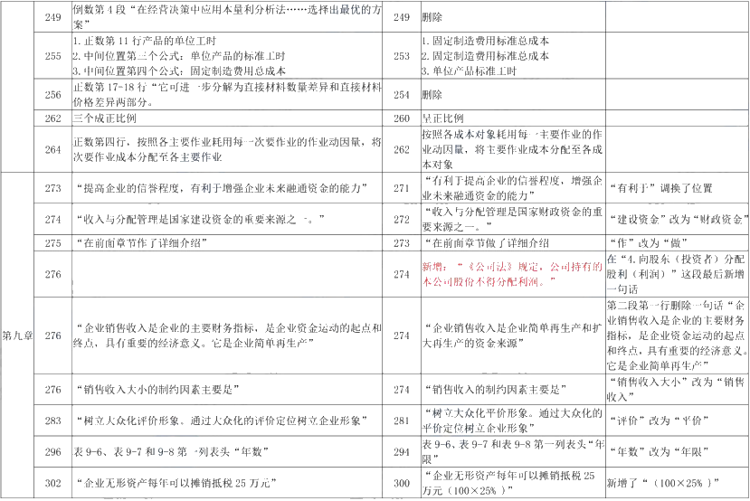 第九章:本章没有实质性变动。修改“国家建设资金”为“国家财政资金”,新增“《公司法》规定,公司持有的本公司股份不得分配利润。”,删除“企业销售收入是企业的主要财务指标,是企业资金运动的起点和终点”。
