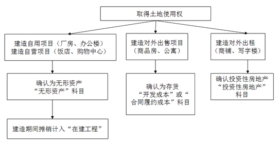 企业取得的土地使用权,通常应当按照取得时所支付的价款及相关税费确认为无形资产。土地使用权用于自行开发建造厂房等地上建筑物时,土地使用权的账面价值不与地上建筑物合并计算其成本,而仍作为无形资产进行核算。但是,如果房地产开发企业取得的土地使用权用于建造对外出售的房屋建筑物的,其相关的土地使用权的价值应当计入所建造的房屋建筑物成本。