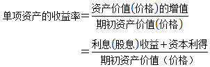 以金额表示 (资产收益额) | 通常以资产价值在一定期限内的增值量来表示,该增值量来源于两部分: (1)期限内资产的现金净收入(利息、红利或股息收益)。 (2)期末资产的价值(或市场价格)相对于期初价值(价格)的升值。即资本利得。 |