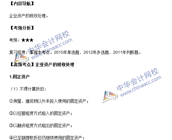 2016年中级会计职称考试进入倒计时阶段了,为了让学员对考试情形有更好地认识,正保会计网校为大家精心整理了2016年中级会计职称考试《经济法》科目的高频考点。下面我们一起来学习2016年中级会计职称《经济法》高频考点:企业资产的税收处理。本考点属于《经济法》第七章企业所得税法律制度第三节的内容。
