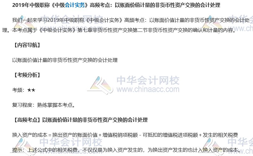 知识是基础,能力是体现。《中级会计实务》考试需要学习的内容多、难度大,是中级会计考试当中难度最大的科目。所以考生对《中级会计实务》高频考点的学习是不可缺少的。正保会计网校各位备战中级会计考试的各位考生带来了《中级会计实务》高频考点,助你成为一名合格的中级会计师!马上开始学习今天的《中级会计实务》高频考点:以账面价值计量的非货币性资产交换的会计处理