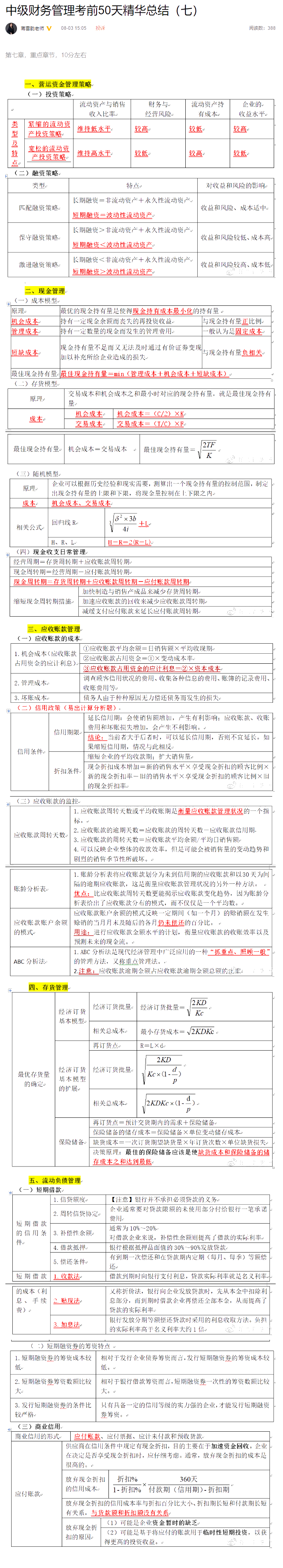 第七章营运资金管理为重点章,主要介绍营运资金管理策略、流动资产管理和流动负债管理。在考试中题型主要是客观题与计算分析题,也可以与其他章节知识合并考综合题。