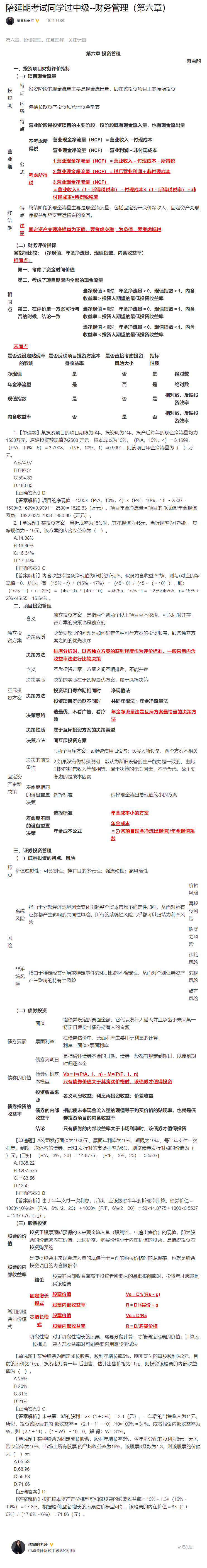 蒋雪韵老师总结:陪延考同学过中级财务管理 (第六章)