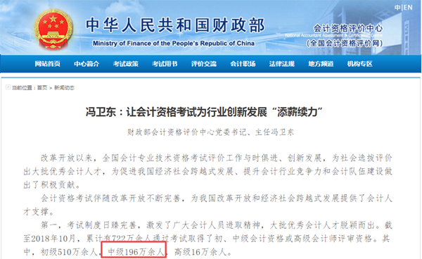 截至2018年10月,累计196万余人通过中级会计职称考试