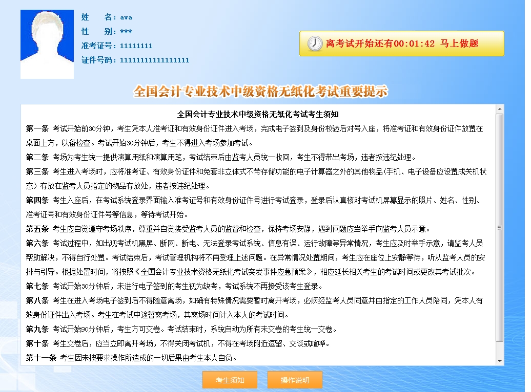 接下来,进入此页面后,各位考生要认真阅读考试提醒,避免发生不必要的错误,有任何问题可以举手示意监考老师,监考老师会尽力为你解决问题(在正式考试中不可以提前答题,但在正保会计网校为大家提供的模拟系统中,各位考生可以提前进入答题,增加练习的时间)。