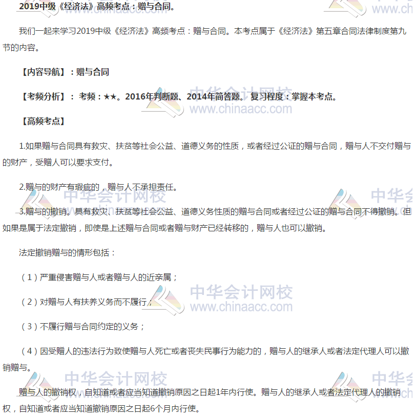 知识是基础,能力是体现。《经济法》考试内容多、杂、细、枯燥,且试题灵活,所以考生对《经济法》高频考点的学习是不可缺少的。正保会计网校为各位备战2019年中级会计考试的各位考生带来了《经济法》高频考点,助你成为一名合格的中级会计师!马上开始学习今天的《经济法》高频考点:赠与合同