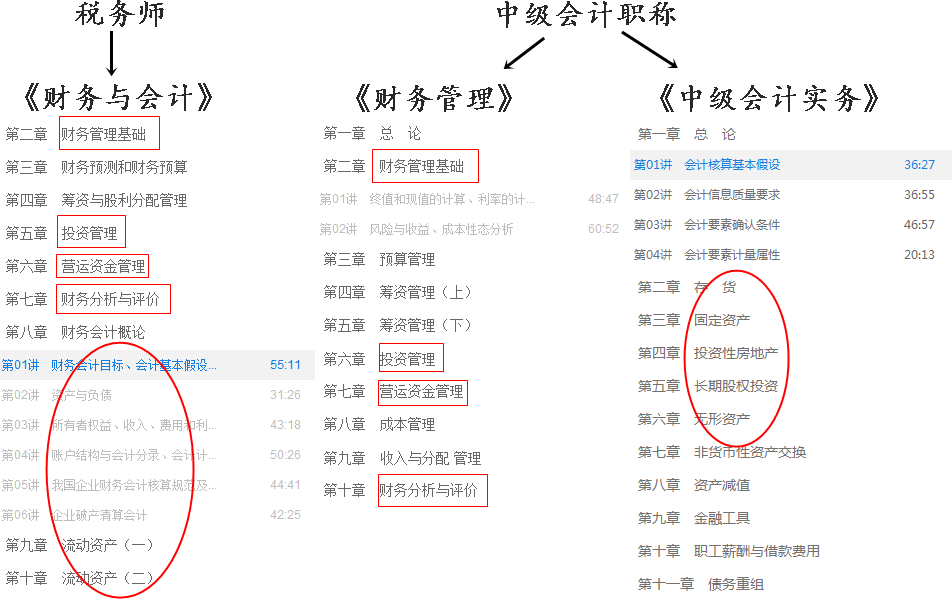上图是中级会计职称《财务管理》、《中级会计实务》与税务师《财会与会计》考试大纲内容的对比,我们不难看出两个考试内容有很多都是相同的。