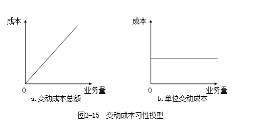 变动成本是指在特定的业务量范围内,其总额会随业务量的变动而呈正比例变动的成本。如直接材料、直接人工、按销售量支付的推销员佣金、装运费、包装费,以及按业务量计提的固定设备折旧等都是和单位产品的生产直接联系的,其总额会随着业务量的增减呈正比例的增减。其基本特征是∶变动成本总额因业务量的变动而呈正比例变动,但单位变动成本(单位业务量负担的变动成本)不变。变动成本习性模型如图2-15所示。