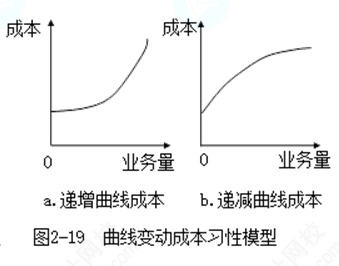 曲线变动成本通常有一个不变的初始量,相当于固定成本,在这个初始量的基础上,随着业务量的增加,成本也逐步变化,但它与业务量的关系是非线性的。这种曲线成本又可以分为以下两种类型∶一是递增曲线成本,如累进计件工资、违约金等,随着业务量的增加,成本逐步增加,并且增加幅度是递增的;二是递减曲线成本,如有价格折扣或优惠条件下的水、电消费成本、"费用封顶"的通信服务费等,用量越大则总成本越高,但增长越来越慢,变化率是递减的。递增曲线成本和递减曲线成本的成本习性模型如图2-19所示。