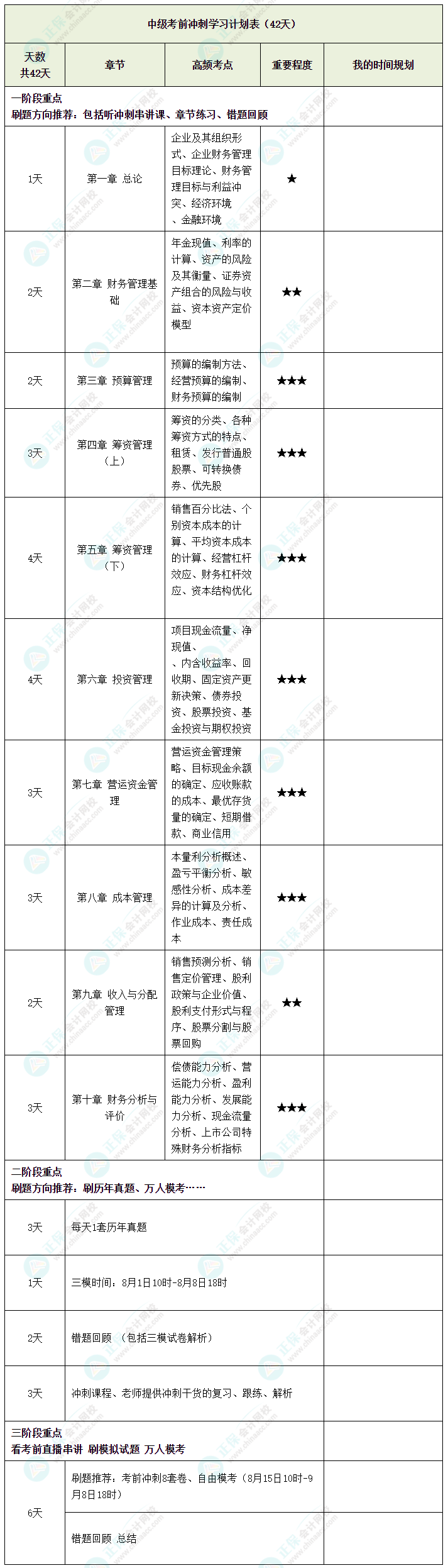 点击下载 《中级财务管理》考前冲刺学习计划表(42天)
