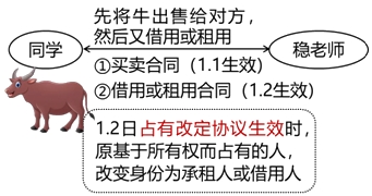【示例3】同学的牛卖给稳老师,同学对稳老师说:“它现在已经是你的牛了,但是再借我用三天”,稳老师同意。同学与稳老师之间达成两份协议,一是买卖牛的合同;二是占有改定协议(借用牛合同),物权自第二份协议“借用合同”生效时移转。