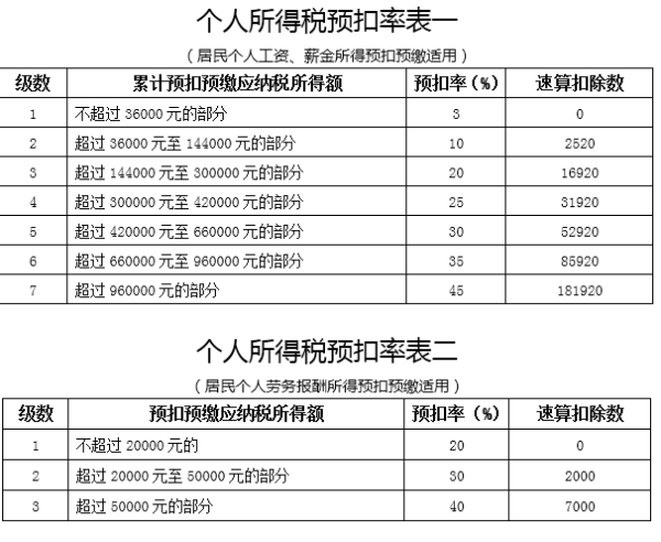上述公式中,计算居民个人工资、薪金所得预扣预缴税额的预扣率、速算扣除数,按《个人所得税预扣率表一》执行。
