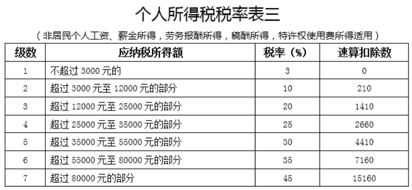 ②劳务报酬所得、稿酬所得、特许权使用费所得,以每次收入额为应纳税所得额,适用按月换算后的非居民个人月度税率表(《个人所得税税率表三》)计算应纳税额。