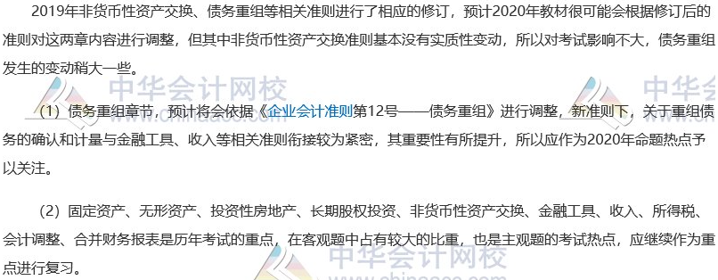 从修订的《企业会计准则第12号——债务重组》中可以看出,修改了“债务重组”的定义、明确了债务重组准则的适用范围、规范了债权人确认受让资产、债务人终止确认负债的条件和时点等新债务重组准则的变化较大,预计对2020年的教材影响也比较大,建议中级会计考生等教材下发后再学习本章,或者是参照新准则进行学习。