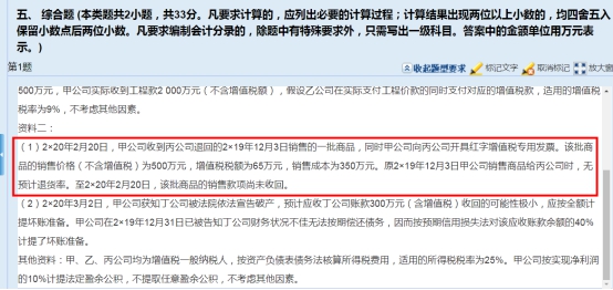 资料三:2021年3月15日,甲公司收到了丙公司因为质量问题退回的一辆汽车。该汽车为2020年12月20日甲公司销售给丙公司的,当时确认销售收入300万元,营业成本250万元,款项尚未收到。假定税法允许调整2020年度的企业所得税。