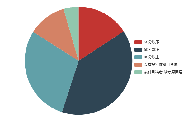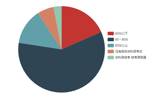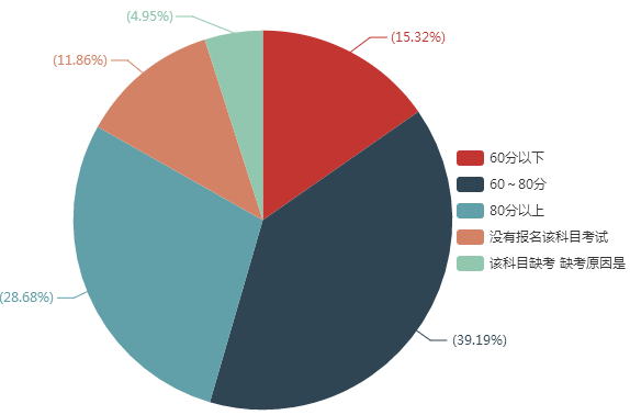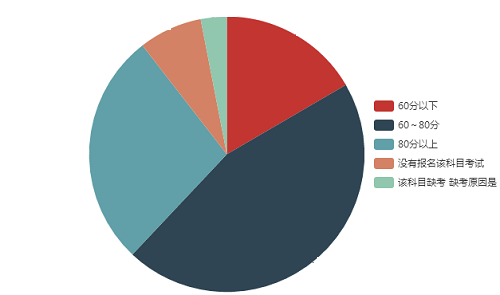由下图数据可以看出在参加《经济法》科目考试的小伙伴中60分以上占81.1%,80分以上占15.3%,60~80分占65.8%,60分以下占18.9%。由三科对比数据可以看出,经济法是60分以下人数比率最大的,经济法知识点多、杂、细、枯燥,说是简单,但是真的记忆起来还是比较难的。对于经济法部分还是容易理解的,只是对大家的记忆力提出了挑战;而税法部分考查计算较多,需要活学活用。