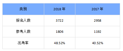 陕西渭南的数据,就比较值得细细“品味”了:本次考试渭南考生报名3722人次,较上年增长25.83%;实际参考1806人次,较上年增长51.51%;出考率48.52%,较上年增加了8.23个百分点。2017年的出考率就更低了,只有40.52%。