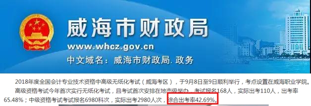 2、山东威海考区综合出考率低至42.69%