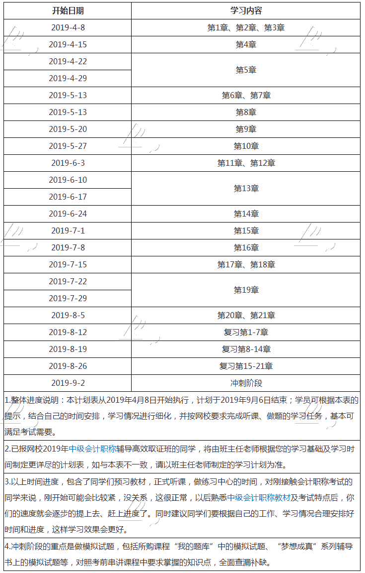 凡事预则立,不预则废。2019年中级会计职称《中级会计实务》教材已经公布,今年的教材不简单,可以说是新教材史上变动最大的一次,几乎每章都有所调整,其中金融资产、收入和政府会计三个重要章节全部按照新准则重新编写,其他章节也是进行了较大的调整,那么中级会计职称应该怎么学习呢?备考中级会计师的考生们要按计划学习,打好基础,这样备考才能事半功倍。备考中级会计职称的考生们做好学习计划了吗?正保会计网校专业老师依据多年教学经验为学员们制定了《中级会计实务》备考计划表,赶快收藏学习吧!