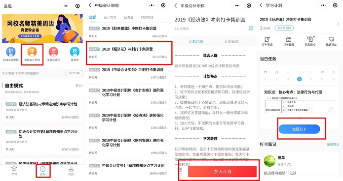 第一步:进入“会计爱打卡”小程序后选择,选择发现板块的中级会计职称。