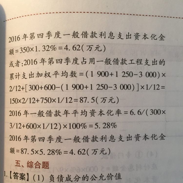 答疑老师回复: 对于一般借款,分录的一般处理步骤是: 借:在建工程等② 财务费用③ 贷:应付利息① ①计算出总的利息; ②计算出应予资本化的金额; ③倒挤出费用化金额(计入财务费用)。 一般借款与专门借款的处理思路有区别,对于专门借款,在资本化期间内,一般没有计入财务费用的内容,只需用应付利息总额扣除闲置资金收入,就能得到专门借款利息资本化金额;而对于一般借款,应该先算出一般借款利息资本化金额,用应付利息总额扣除一般借款利息资本化金额,倒挤得到费用化金额。重点在于一般借款利息资本化金额的计算。 一般借款利息资本化金额的计算应注意: 1.计算累计资产支出超过专门借款部分的资产支出加权平均数 主要是看超过专门借款部分的各笔资产支出的具体金额与发生时间,用各笔支出金额乘以相应的时间权数即可得到该资产支出加权平均数。加权使用的是时间的权数。 举例:假定企业借款均为一般借款,按季度计算资本化金额,某年1月1日支出600万元,2月1日支出100万元,3月1日支出100万元,则计算第一季度累计资产支出超过专门借款部分的资产支出加权平均数=600×90/90+100×60/90+100×30/90。 【注】计算时间权数时,分母取决于企业多长时间计算一次资本化金额。如果是分季度计算资本化金额,则分母是90天(或3个月),如果是按年计算资本化金额,则分母是360天(或12个月)。 2.计算一般借款的资本化率(加权平均的资本化率) ①如果所占用的一般借款只有一笔,则一般借款的资本化率就是该笔借款的利率。 接上例,假定该企业只占用了一笔一般借款,年利率为6%,则: 该一般借款在第一季度总的应付利息=一般借款总额×6%×(3/12); 该一般借款在第一季度应予资本化的金额 =第一季度累计资产支出超过专门借款部分的资产支出加权平均数×6%×(3/12); 然后,再倒挤除财务费用。 ②如果所占用的一般借款不止一笔,此时需要计算加权平均资本化率。 加权平均资本化率=所占用的一般借款在某一期间实际发生的利息费用总额/所占用的一般借款本金加权平均数 3.一般借款利息资本化金额 =累计资产支出超过专门借款部分的资产支出加权平均数×一般借款的资本化率 4.借款存在折价或者溢价时,借款利息的处理与溢折价的摊销实际上是分不开的,因为按照实际利率法计算确定的利息费用(计入财务费用/在建工程)=应付利息+/-利息调整摊销额。 |