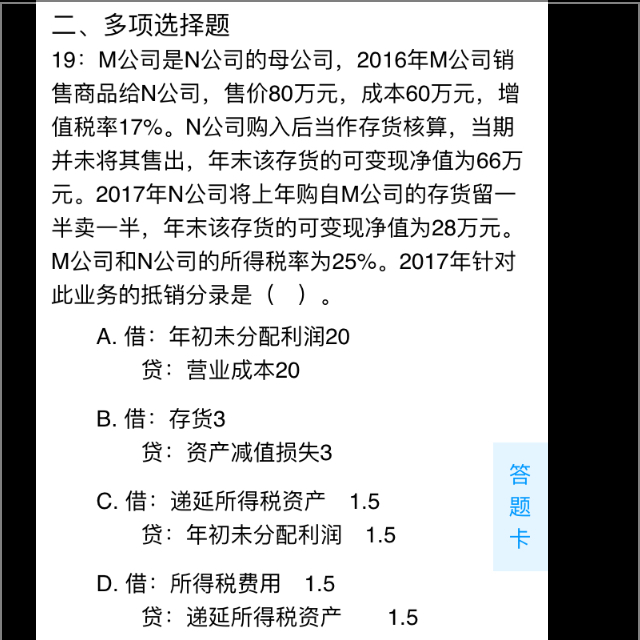答疑老师回复: 本题分录: 2016年: 借:营业收入 80 贷:营业成本 60 存货 20 个别报表计提减值=80-66=14,合并报表角度不承认,要抵销: 借:存货 14 贷:资产减值损失 14 借:递延所得税资产 (20-14)*25%=1.5 贷:所得税费用 1.5 2017年: 借:未分配利润——年初 20 贷:营业成本 20 借:营业成本 10 贷:存货 10 借:存货 14 贷:未分配利润——年初 14 个别报表角度出售50%,则结转存货跌价准备7,并冲减营业成本,合并报表角度不承认,所以要抵销: 借:营业成本 7 贷:存货 7 个别报表角度期末存货跌价准备应有余额=40-28=12,已有余额7,所以补提5,合并报表角度认为应计提=30-28=2,所以要抵销3: 借:存货 3 贷:资产减值损失 3 借:递延所得税资产 (20-14)*25%=1.5 贷:未分配利润——年初 1.5 借:所得税费用 1.5 贷:递延所得税资产 1.5 |