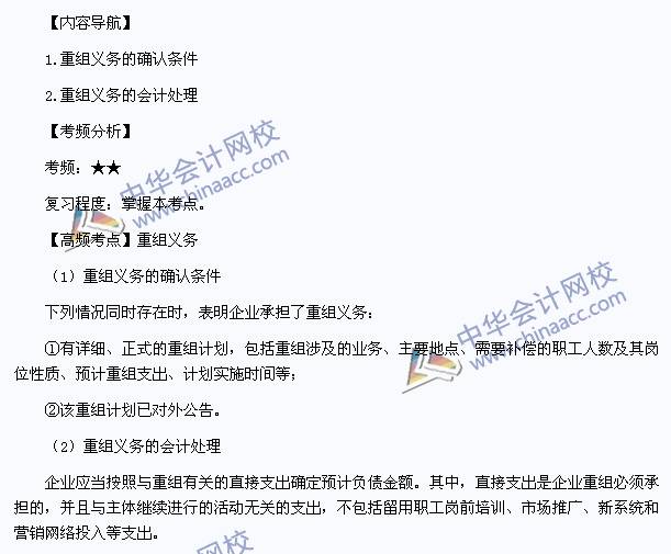 我们一起来学习2013年中级会计职称《中级会计实务》高频考点:重组义务。本考点属于《中级会计实务》第十三章或有事项第三节或有事项会计处理原则的应用的内容。