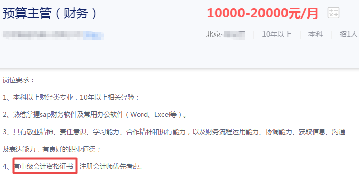 根据各大招聘网站的招聘需求可以看出,现在企业不再仅仅需要一个能做账的会计了,更多的企业希望自己的会计人员能够协助公司进行年度预算编制和预算调整工作,而且岗位薪酬也较为可观,一般在8000-10000左右,对于学历要求并没有做太高要求,一般集中在大专以上,所以拿下中级会计职称的你,预算主管也是一个不错的选择哦。