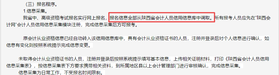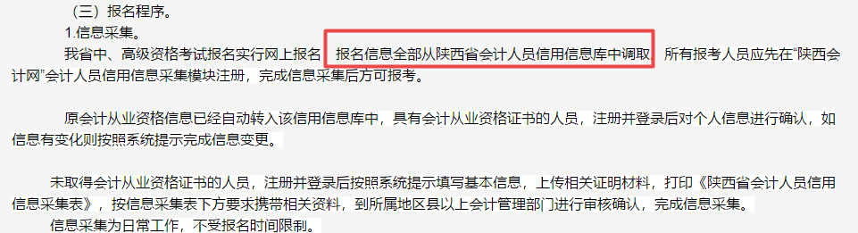 陕西省中、高级资格考试报名实行网上报名,报名信息全部从陕西省会计人员信用信息库中调取。所有报考人员应先在“陕西会计网”会计人员信用信息采集模块注册,完成信息采集后方可报考。(!!!)查看详情>>