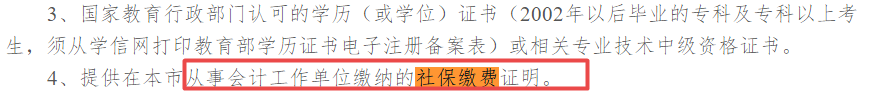 审核材料第四条: 提供在本市从事会计工作单位缴纳的社保缴费证明。查看中级报名更多细节>>