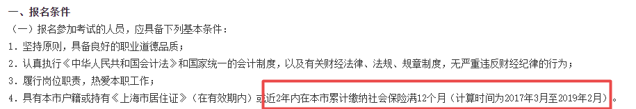 上海要求:按照属地化管理的要求,具有本市户籍或持有上海市居住证(在有效期内,不含上海市临时居住证),且符合其他条件的人员方可在本市报名参加全国会计专业技术中、高级资格考试。