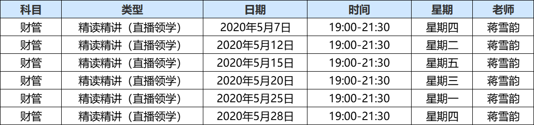 | 财务管理 | 精读精讲(直播领学) | 2020年4月29日 | 19:00-21:30 | 星期三 | 蒋雪韵 |