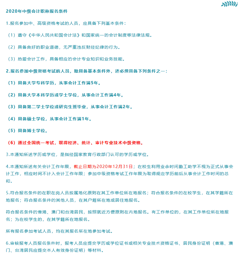 这其中的第2条的第(6)条:通过全国统一考试,取得经济/统计/审计专业技术中级资格,也就是说取得经济/统计/审计专业技术中级资格的考生可以没有学历及工作年限的限制可直接报考中级会计职称。