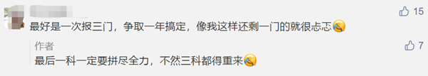 至于报考几科,建议大家直接报考3科,能一年拿下的就不要用两年,毕竟早一年拿证,就多一点竞争力,另外小编也很同意上面考生说的“明天和意外永远不知道哪个先来”。不要把今天努努力就能完成的事情留到明天!