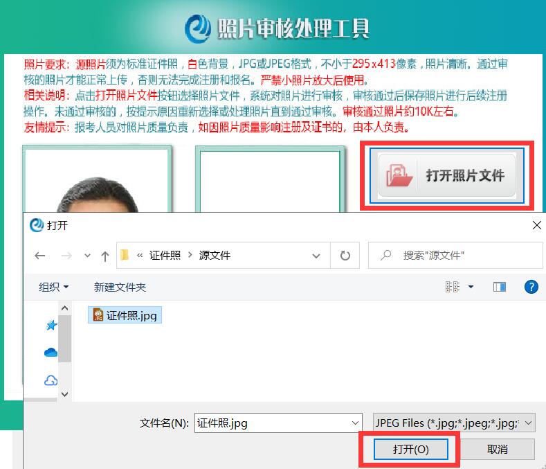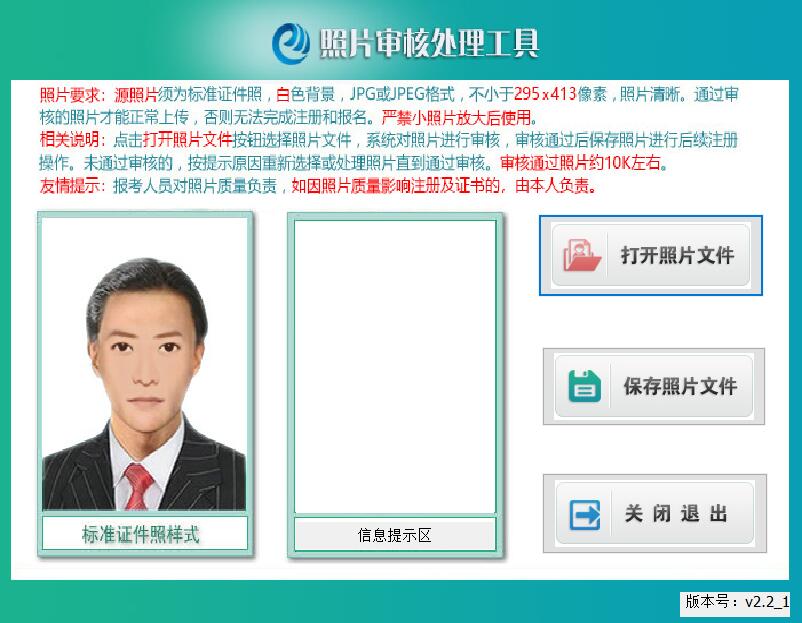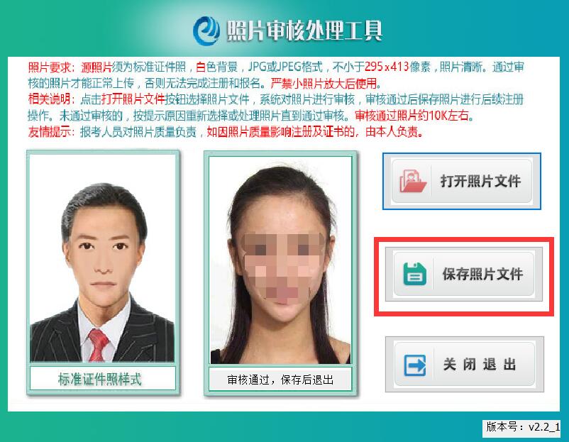 ◆ 本工具是报名照片审核处理工具,只有审核通过的照片才能在报名注册时正常上传。 ◆ 源照片文件必须是标准证件数字照片,白色背景,JPG格式,大于10KB,像素>=295*413。 ◆ 为保证照片清晰度,禁止将像素数量不满足要求的照片进行放大后使用。 ◆ 报考人员对照片质量负责,如因照片质量影响考试、成绩或证书的,由报考人员本人负责。 |