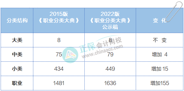 与2015年相比,《大典》维持8个大类、增加4个中类、15个小类、155个职业等。