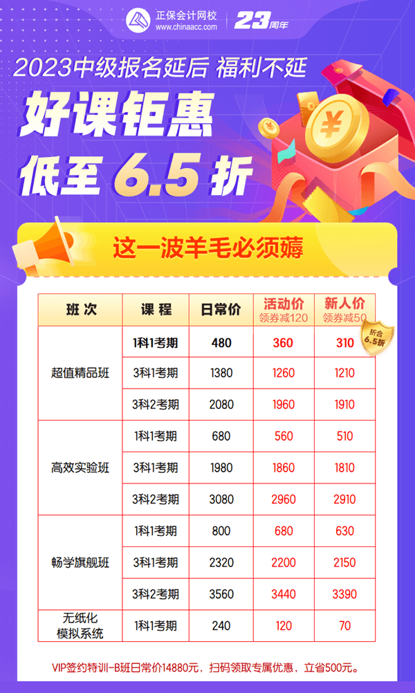 2023年中级会计职称备考已经开始啦!报名延后,福利不缺席!中级会计报课领券立减120元(满200即可使用),更可与新人50元券、APP10元叠加使用!同购图书至低享5折优惠!福利优惠2月28日截止!